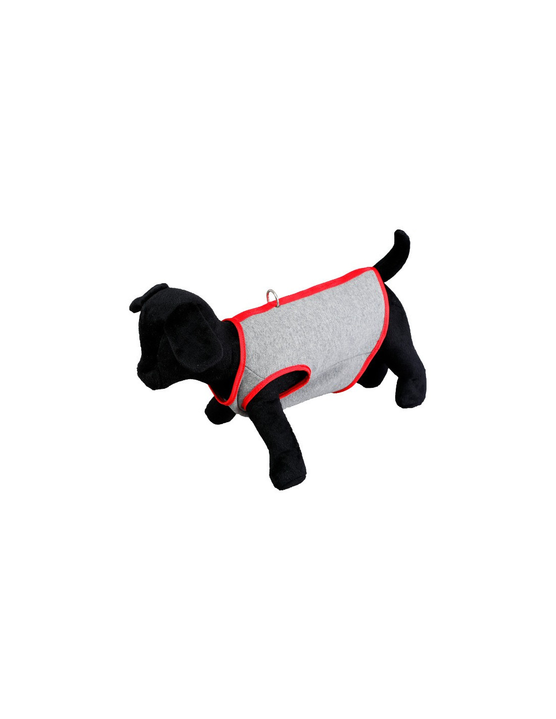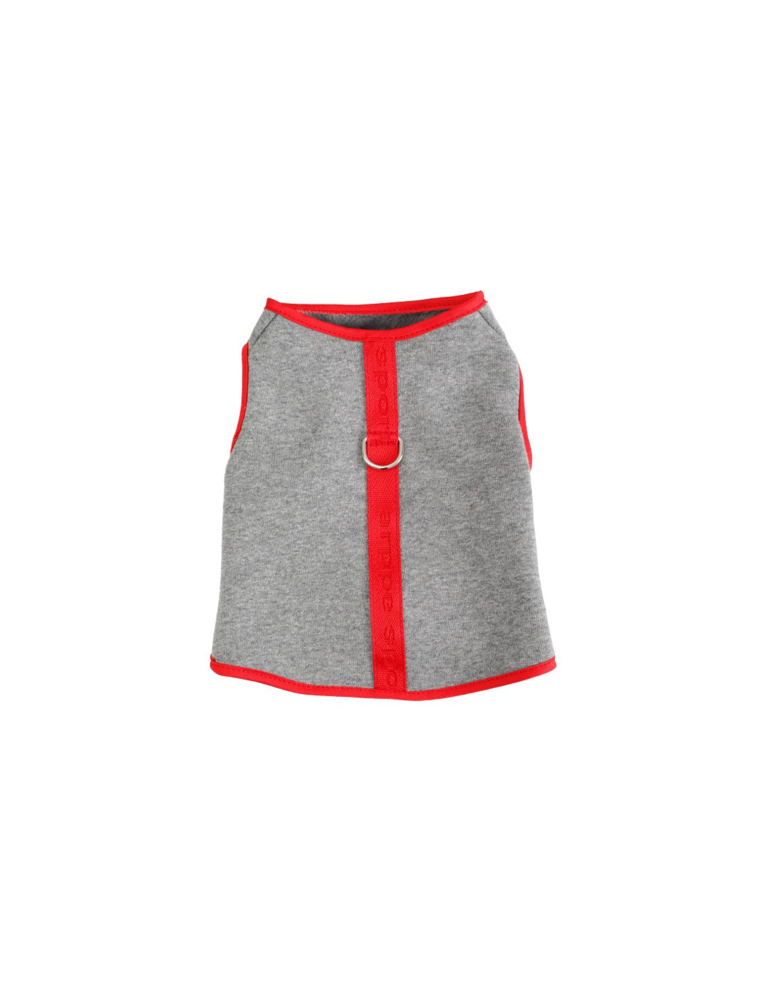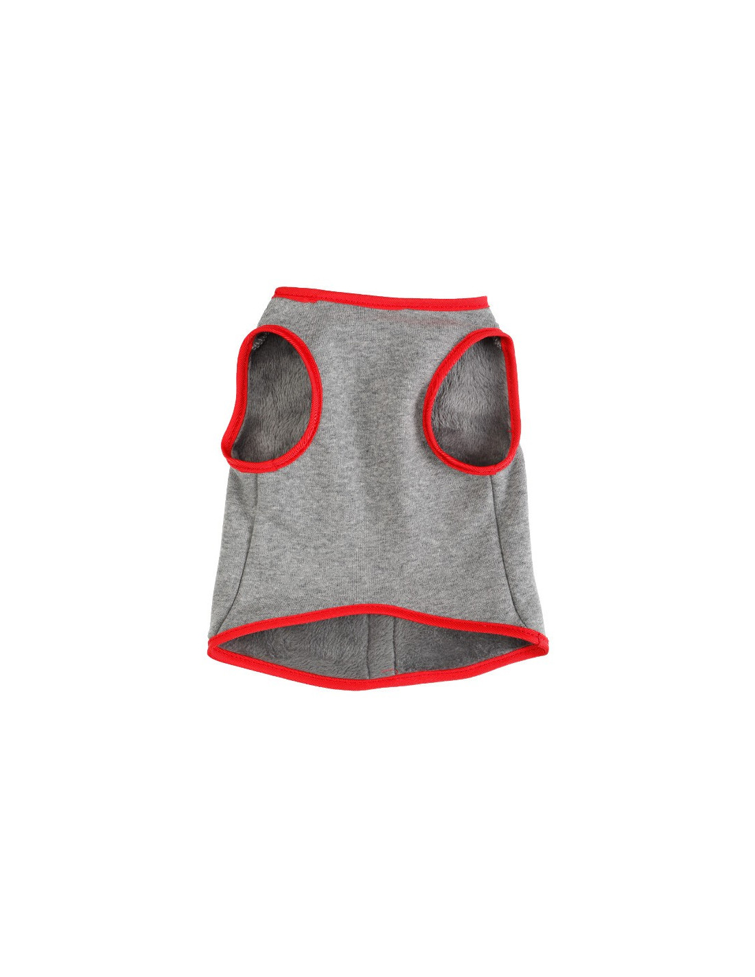 Chaleco en color gris y rojo forrado la parte interior por un forro polar suave en color gris. Dispone de una anilla para poner la correa o flexi a la hora del paseo.