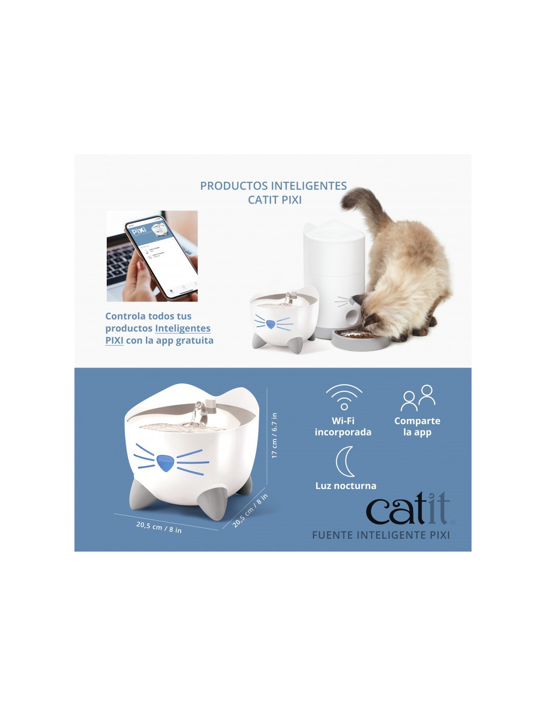 La Catit PIXI Fuente Inteligente es una fuente para gatos con una capacidad de 2 litros. Ofrece una solución inteligente para proporcionar agua fresca y filtrada a tu gato. Esta fuente cuenta con un diseño moderno y compacto que se integra fácilmente en cualquier hogar. Con su sistema de filtración de triple acción, asegura que el agua esté limpia y fresca en todo momento. Además, su funcionamiento silencioso y eficiente la hace ideal para el uso en interiores.