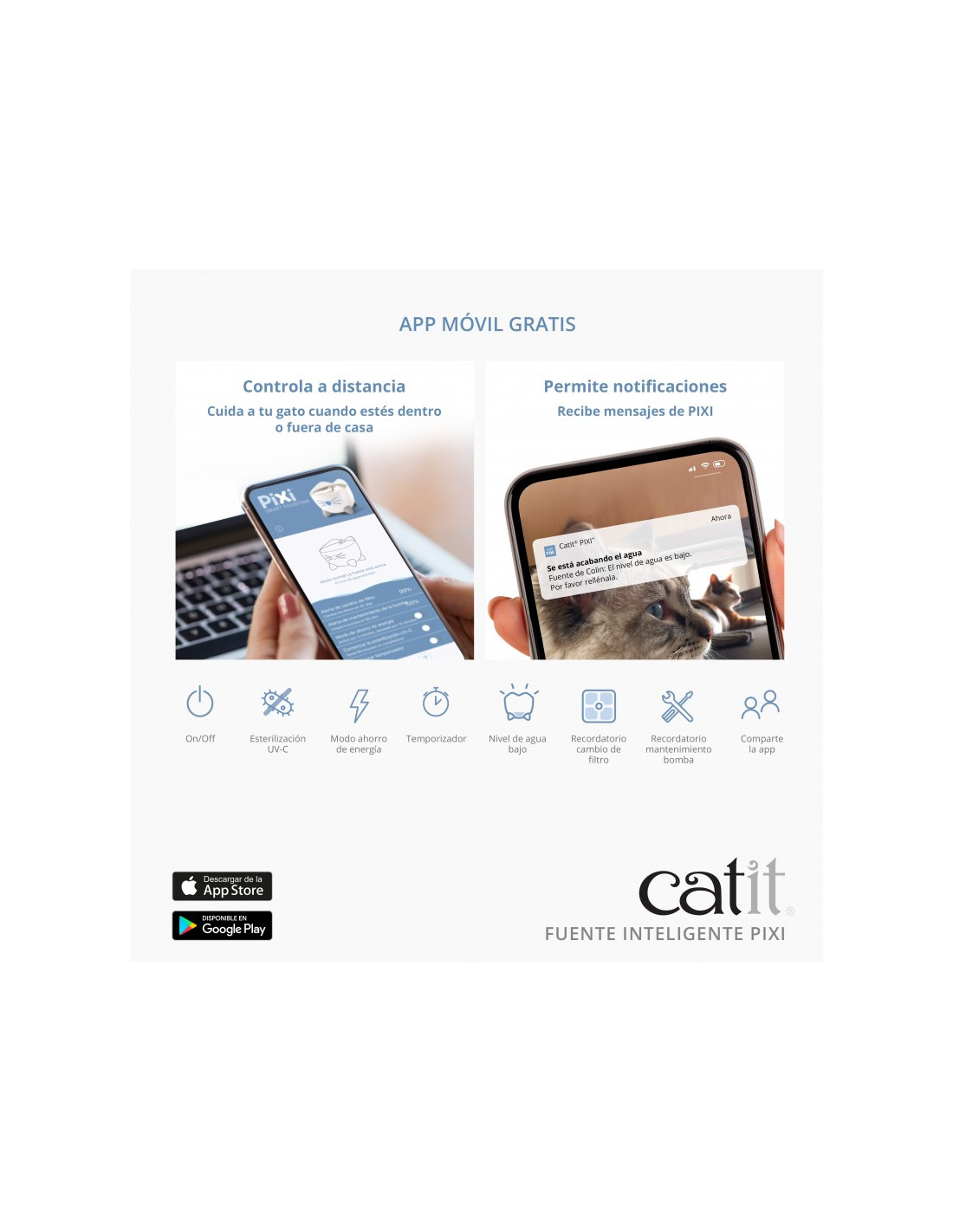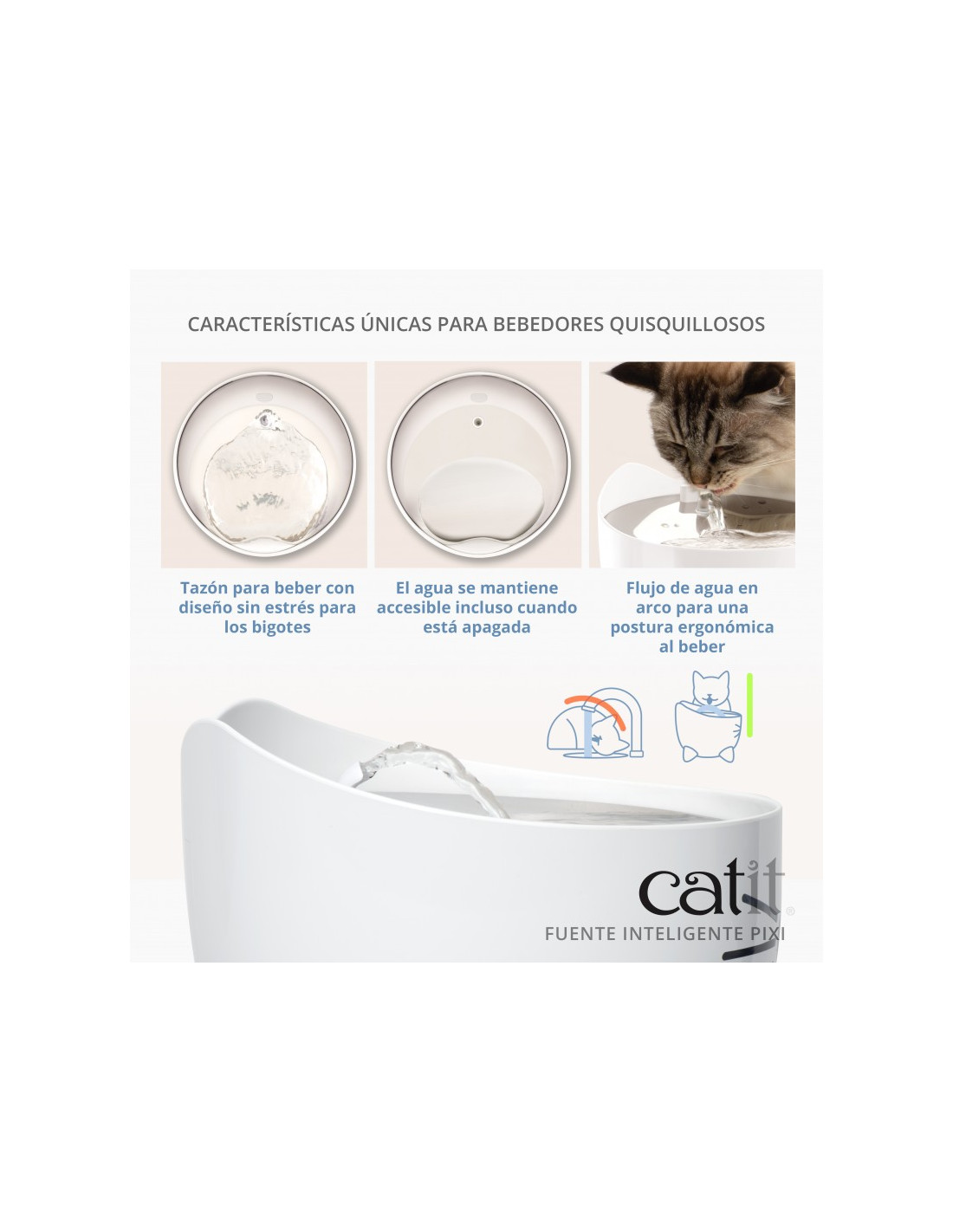 La Catit PIXI Fuente Inteligente está diseñada para ser fácil de usar y mantener. Cuenta con un diseño desmontable que facilita la limpieza y el llenado del depósito de agua. Además, su funcionamiento silencioso asegura que tu gato no se sienta intimidado por ruidos molestos.