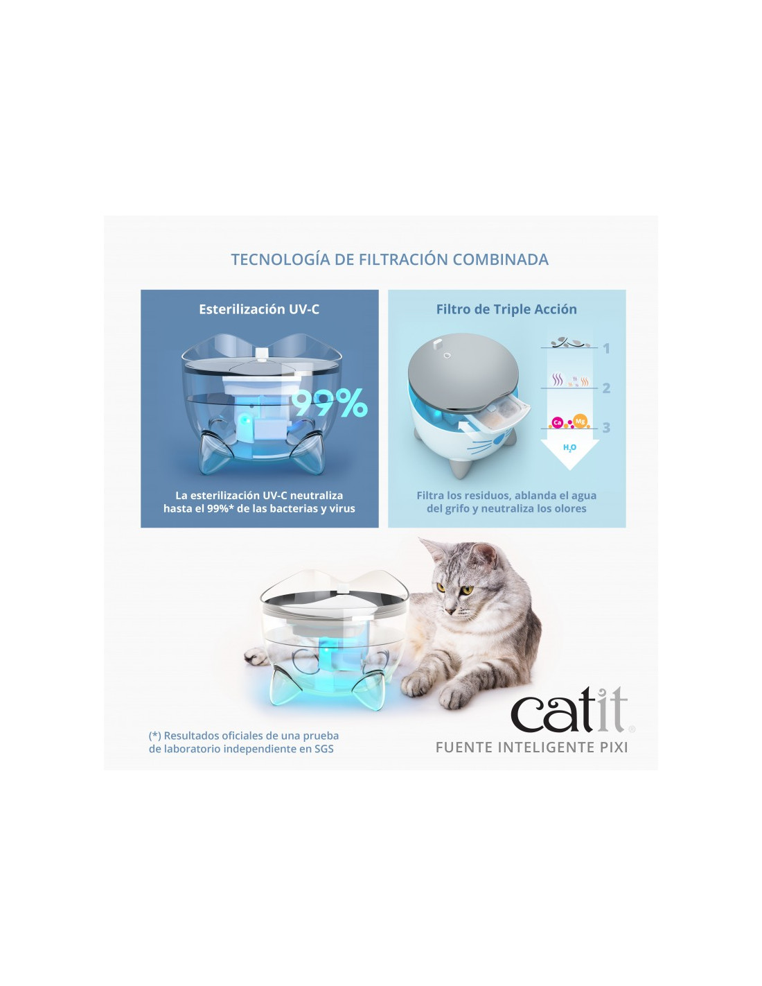 Una de las características destacadas de esta fuente es su sistema de filtración de triple acción. Este sistema garantiza que el agua esté siempre limpia y fresca, eliminando los pelos, residuos y olores del agua. Además, el filtro de carbón activo ayuda a eliminar las impurezas y proporciona un agua más saludable para tu gato.