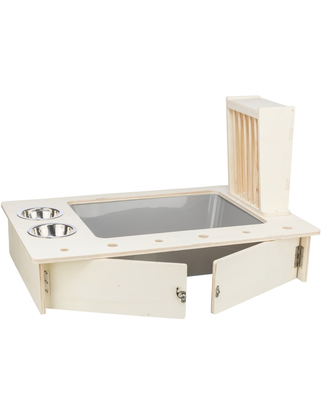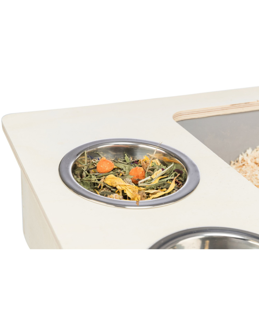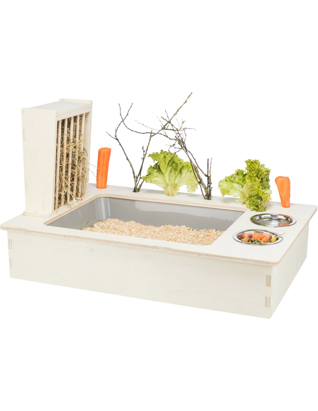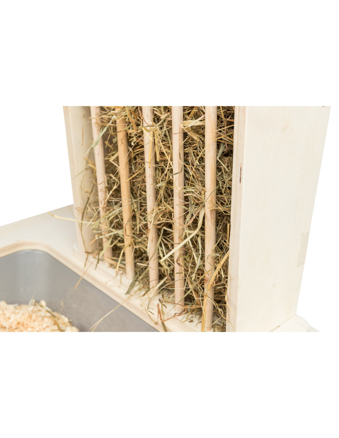 - con 2 comederos de acero inoxidable y el estante de heno