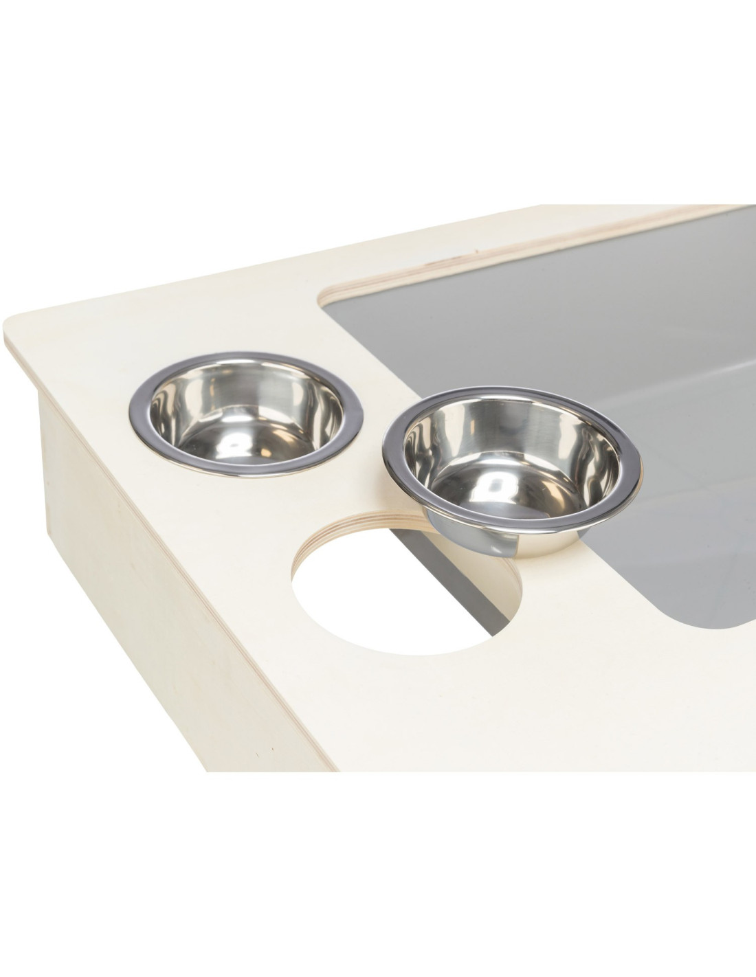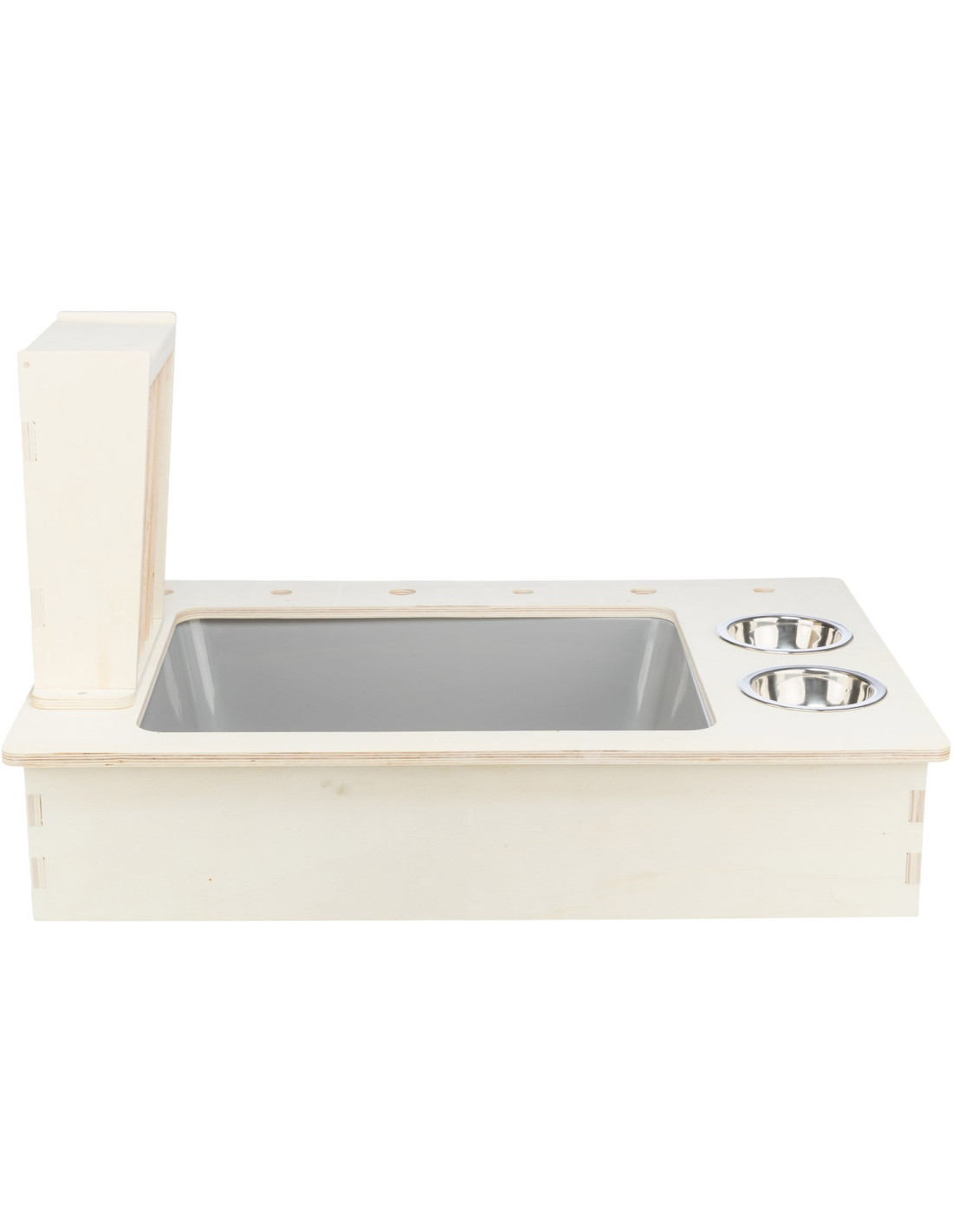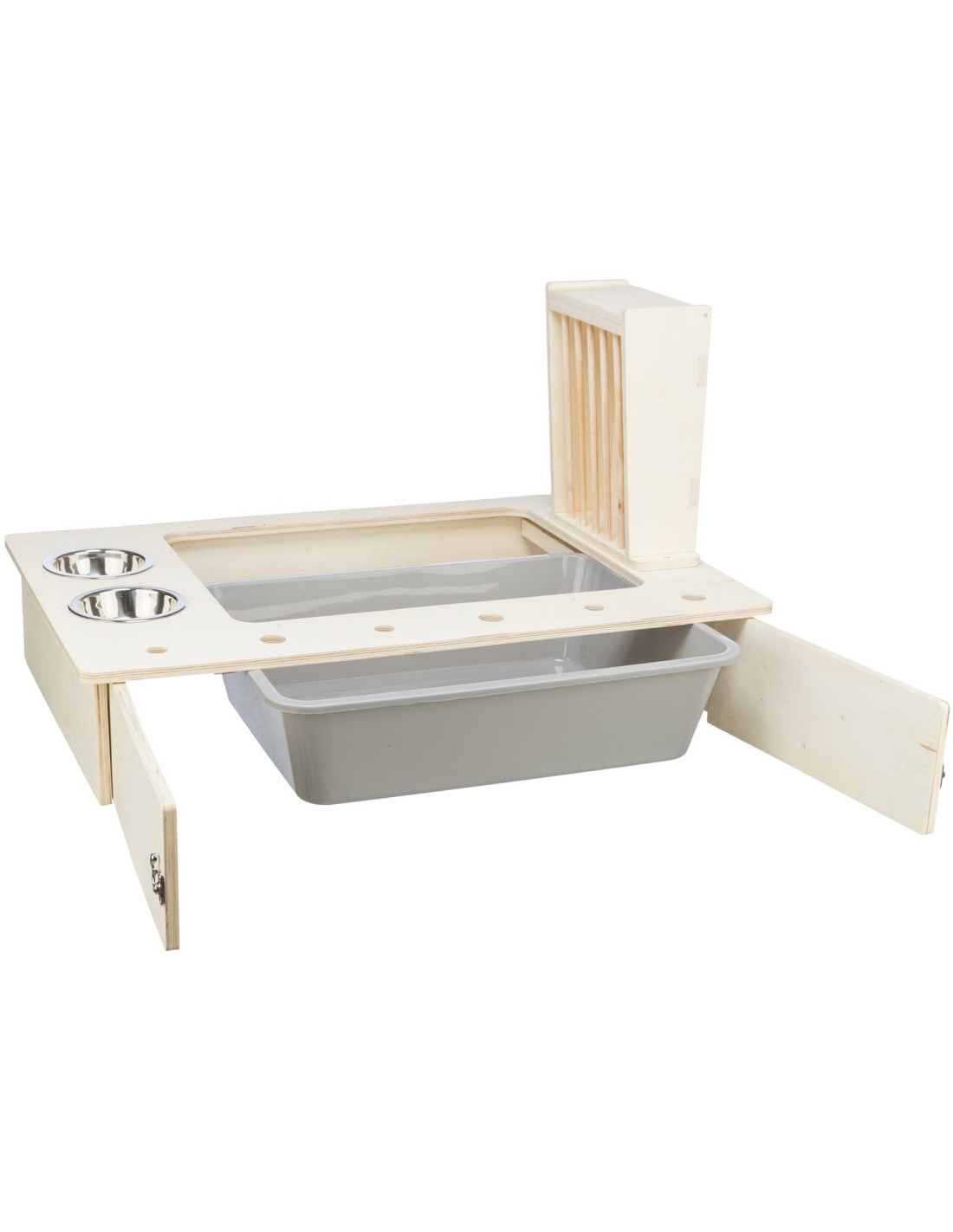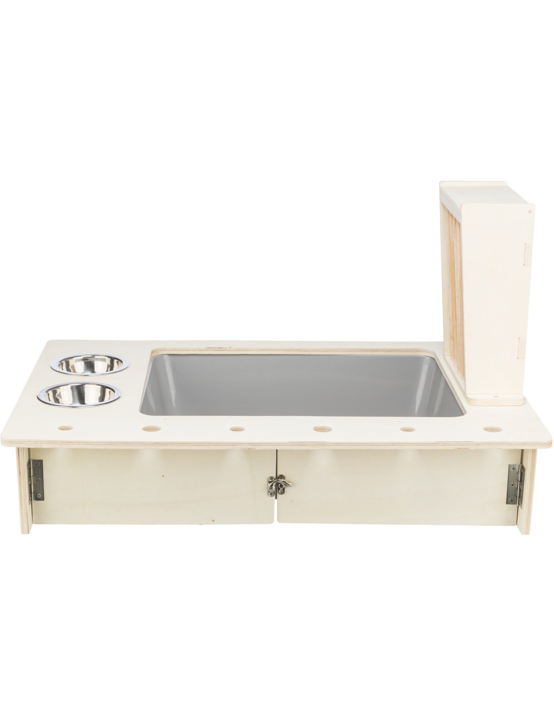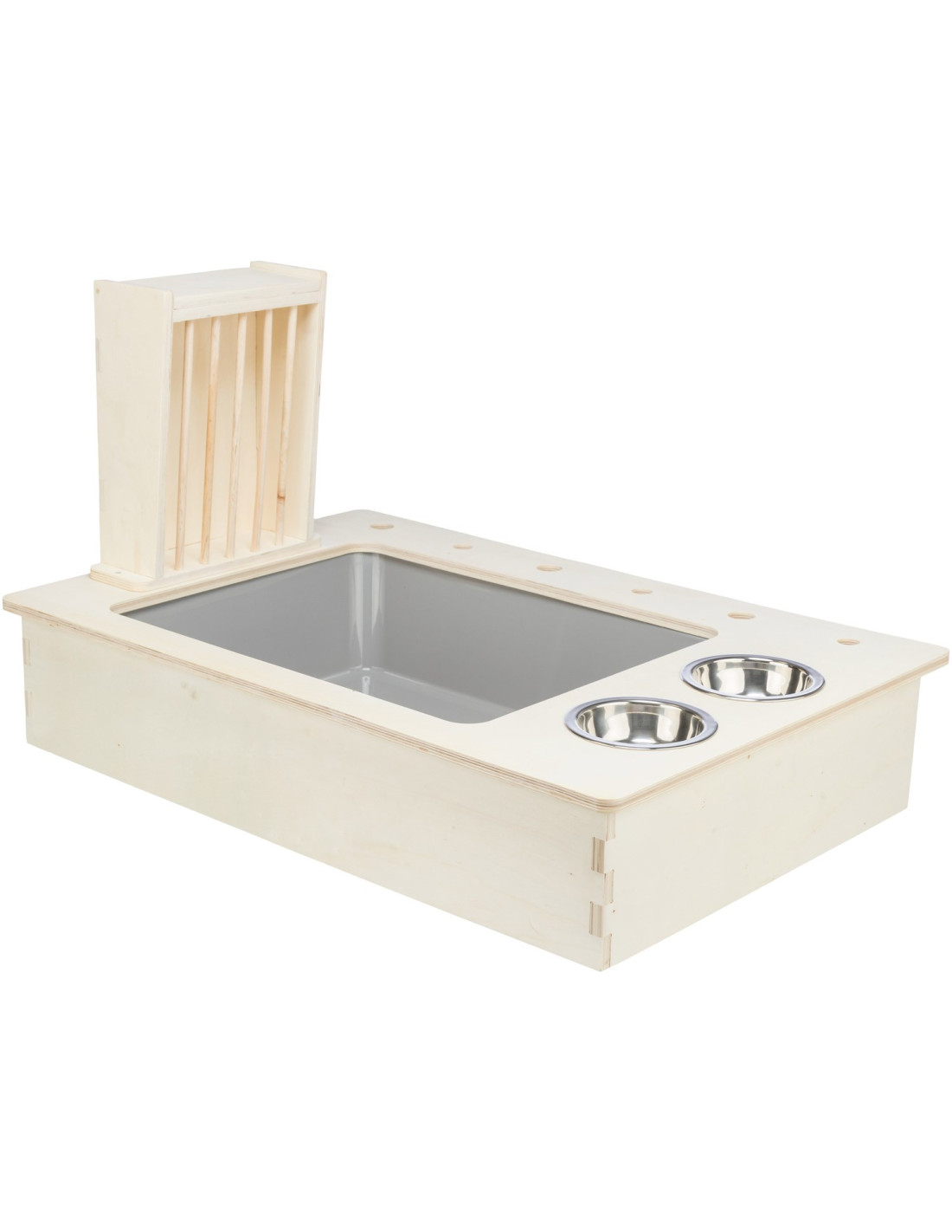 - con 2 comederos de acero inoxidable y el estante de heno