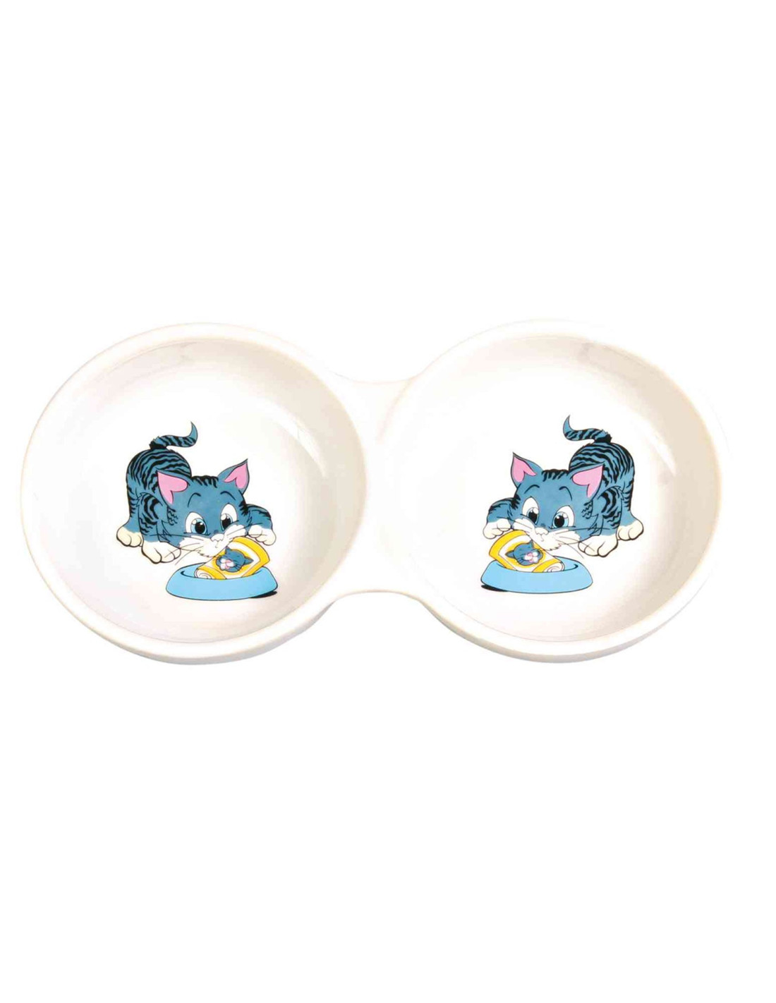 El "Comedero de Cerámica Doble, impresión, 2 x 0.15 litros, ø11 cm, Blanco" parece ser un comedero diseñado para mascotas, con algunas características específicas: