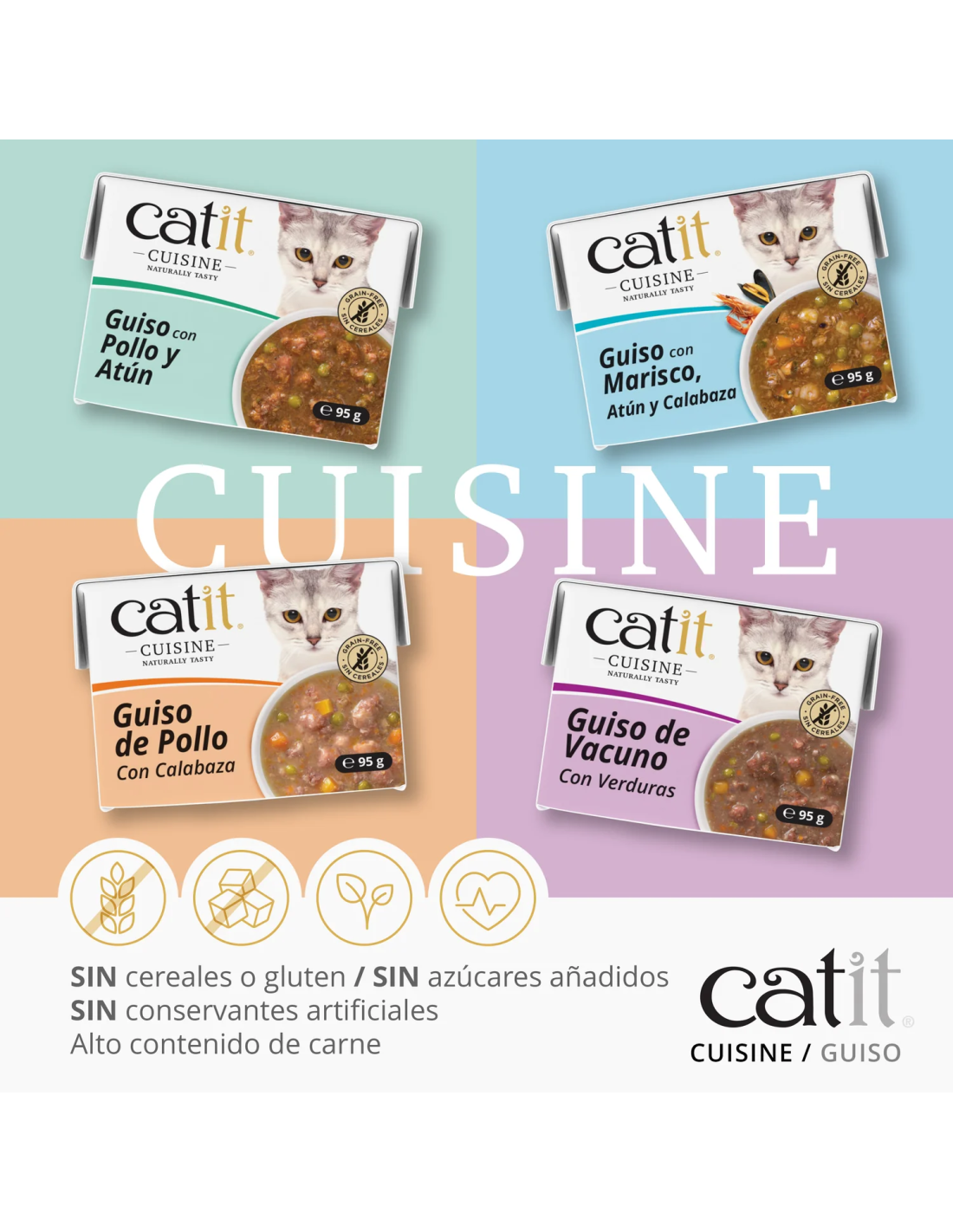 El Catit Cuisine Guiso es una deliciosa receta húmeda elaborada con ingredientes naturales de alta calidad, pensada para satisfacer incluso a los gatos más exigentes.