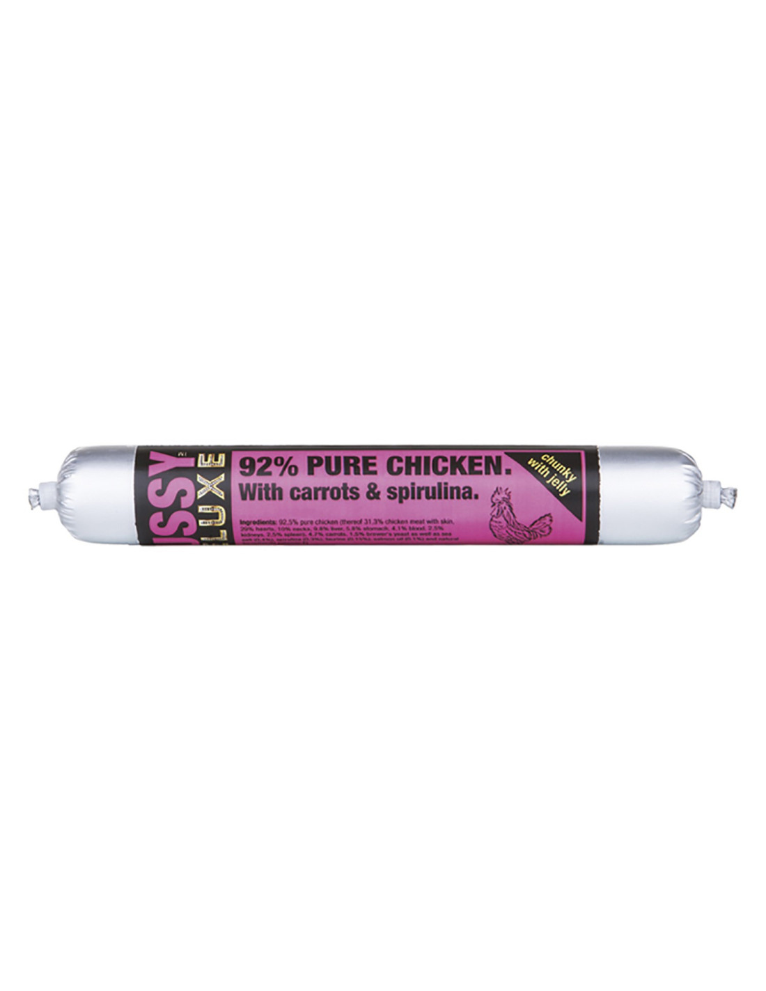 Salchicha PUSSY DELUXE con zanahorias y espirulina.