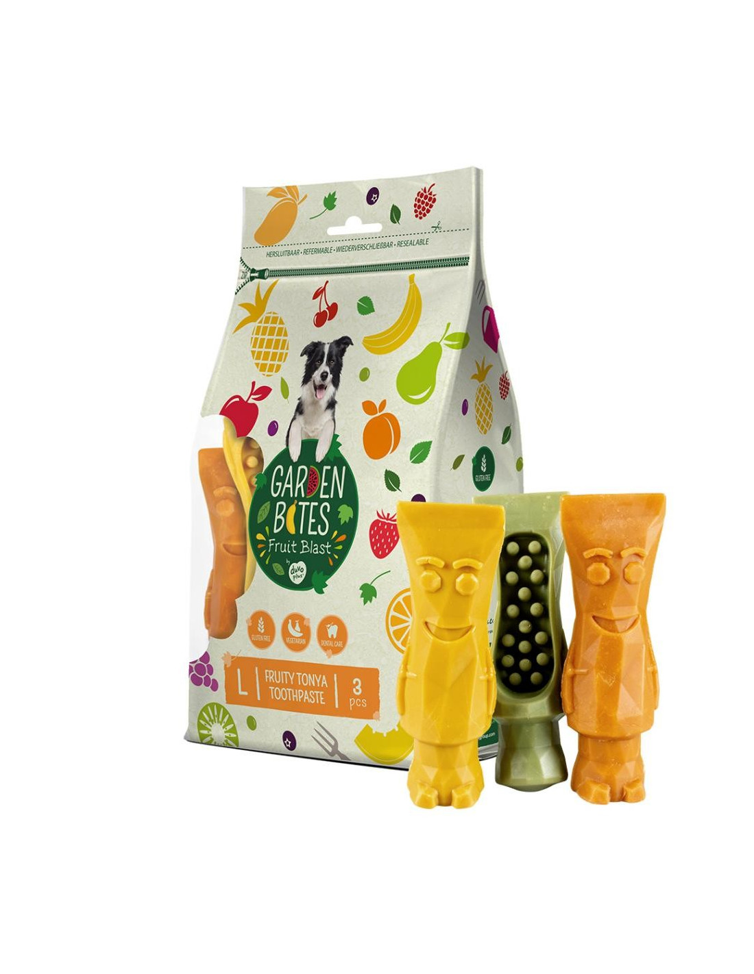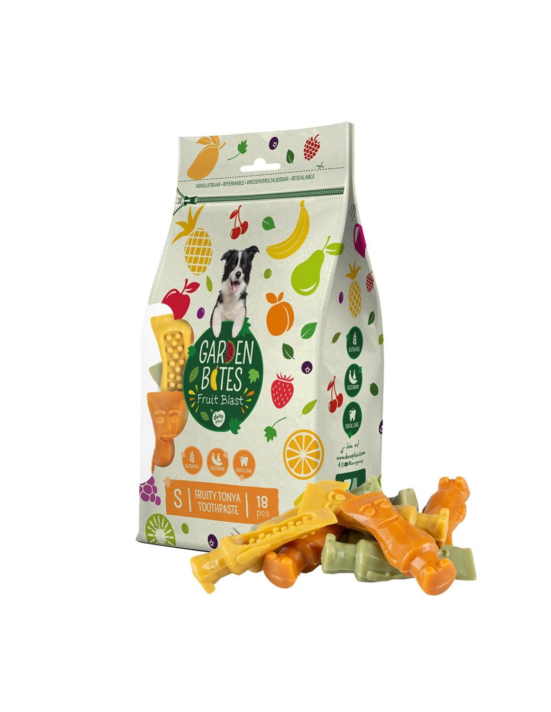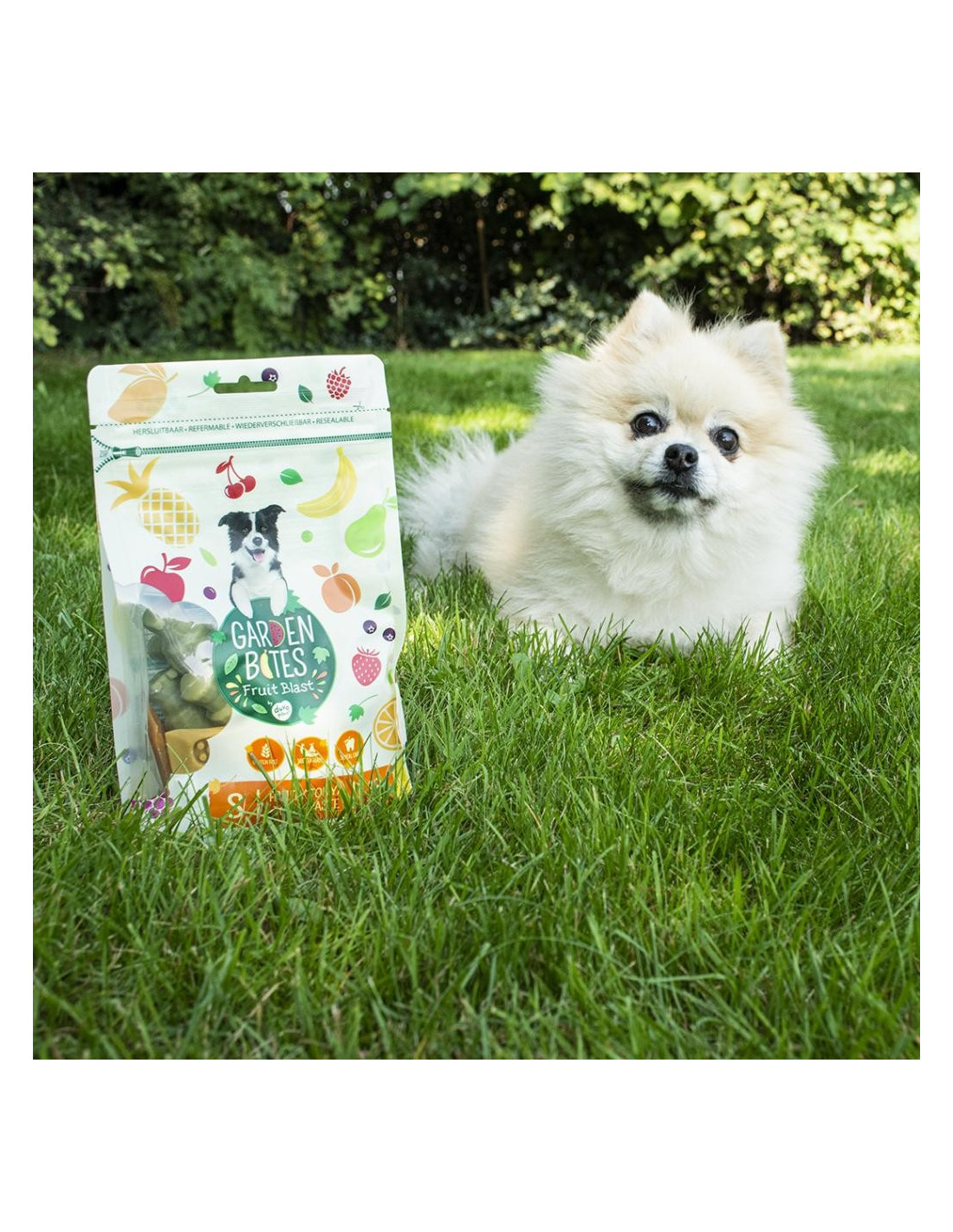 Los Garden Bites vegetarianos de Duvoplus constituyen el premio o aperitivo ideal para su perro. Los Garden Bites cuentan no menos de un 55% de boniato. Los boniatos son un complemento estupendo a la dieta de su perro, siendo ricas en vitaminas, calcio y hierro, entre otros. Esta versión "Fruit Blast" está enriquecida con sabroso plátano, melocotón y pera, lo cual se encarga de ofrecer una verdadera sensación frutal para su perro. Gracias a su forma especial, masajea y limpia la dentadura sin esfuerzo. Además, el extracto de menta natural se encarga de aportar un aliento fresco. Los snacks son 100 % sin gluten, lo que hace que sean fácilmente digeribles y especialmente aptos para perros con alergias. ¡Sus divertidas formas hacen que estos snacks sean completamente irresistibles!