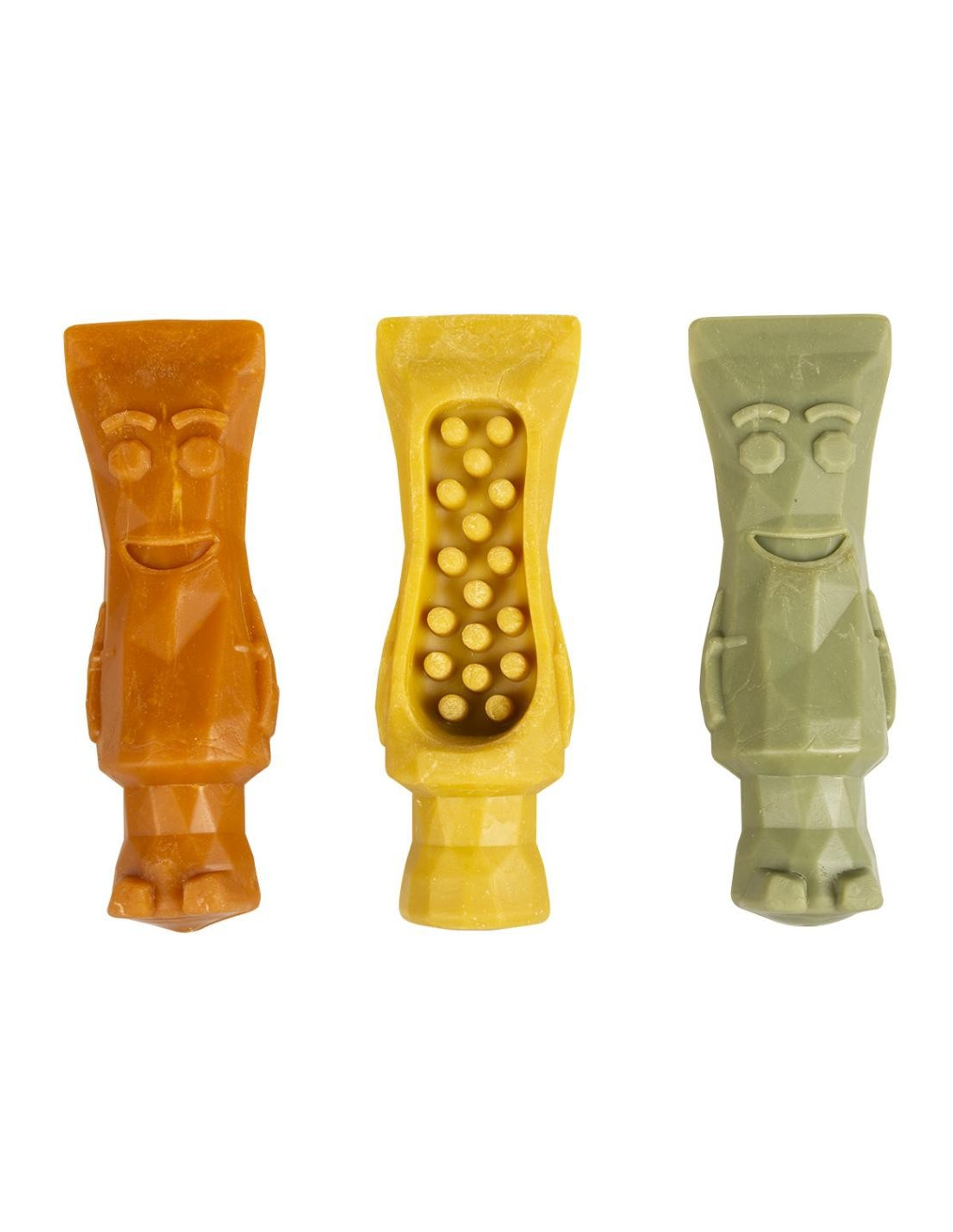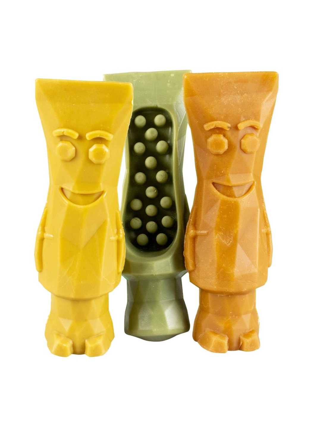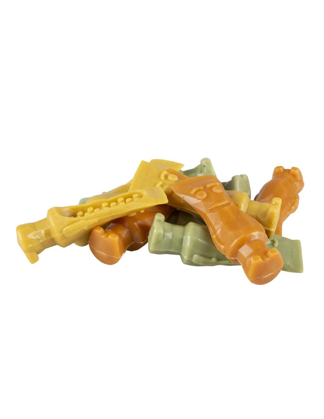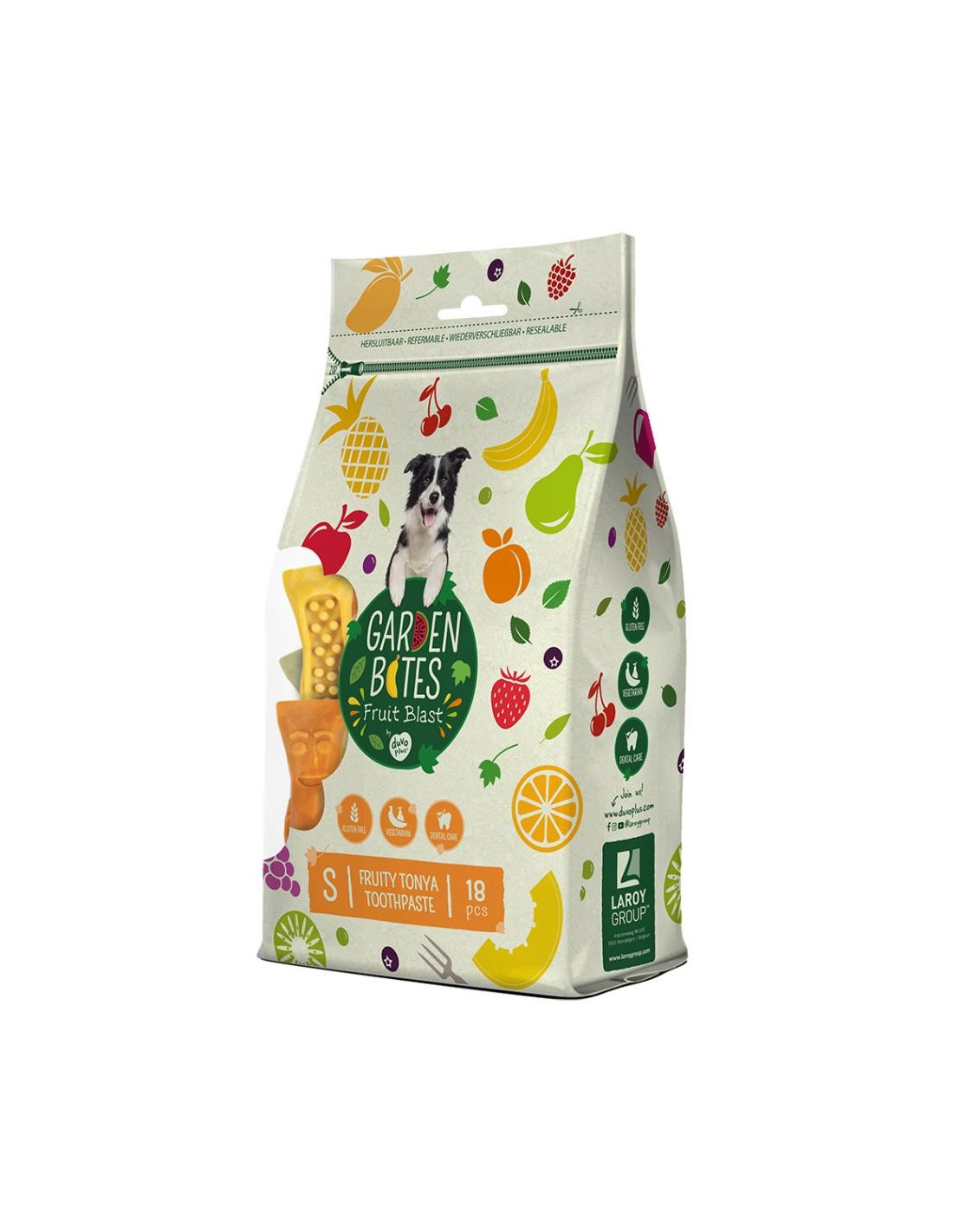 Los Garden Bites vegetarianos de Duvoplus constituyen el premio o aperitivo ideal para su perro. Los Garden Bites cuentan no menos de un 55% de boniato. Los boniatos son un complemento estupendo a la dieta de su perro, siendo ricas en vitaminas, calcio y hierro, entre otros. Esta versión "Fruit Blast" está enriquecida con sabroso plátano, melocotón y pera, lo cual se encarga de ofrecer una verdadera sensación frutal para su perro. Gracias a su forma especial, masajea y limpia la dentadura sin esfuerzo. Además, el extracto de menta natural se encarga de aportar un aliento fresco. Los snacks son 100 % sin gluten, lo que hace que sean fácilmente digeribles y especialmente aptos para perros con alergias. ¡Sus divertidas formas hacen que estos snacks sean completamente irresistibles!