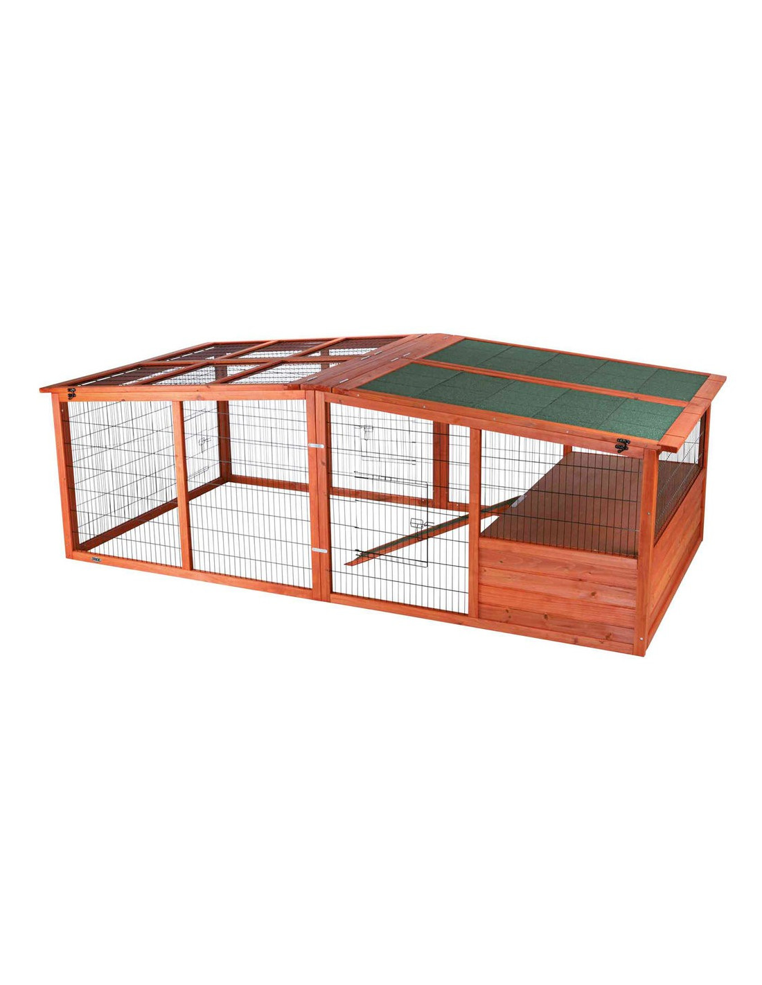 Recinto Exterior XL con Cubierta para conejos, cobayas, erizos o tortugas de tierra. Fabricado por la marca alemana Trixie de madera de pino barnizada. Dispone de rejilla metálica muy estable cubierta con pintura lacada inofensiva para los roedores. La cubierta evitará que las mascotas salten fuera del recinto y nuestras mascotas estarán protegidos de aves de presa y gatos en nuestro jardín.