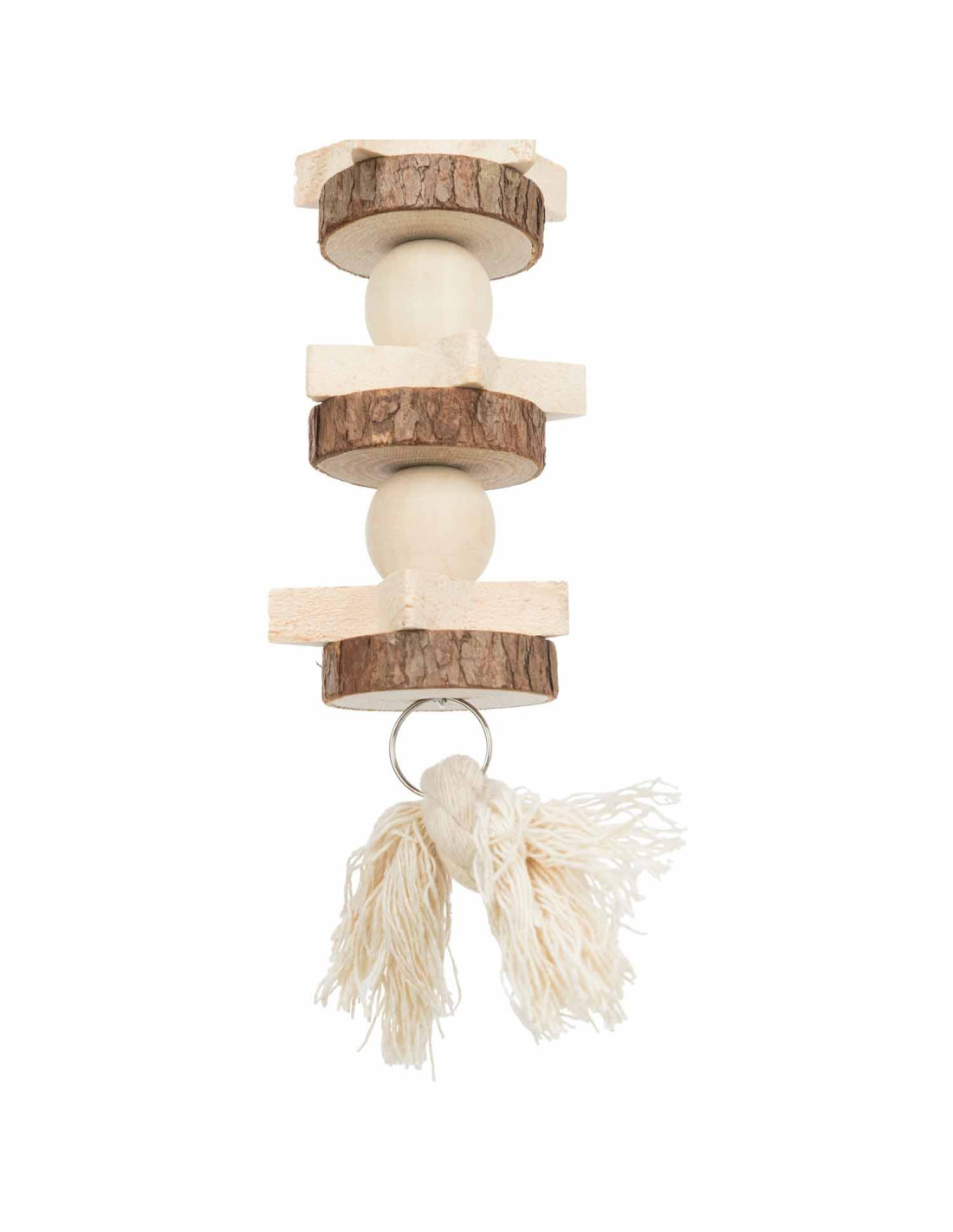 Incorpora una cadena metálica resistente y cuerdas de colores que permiten colgarlo fácilmente en la jaula, ofreciendo múltiples posibilidades de juego: trepar, picotear, balancearse y morder. Sus piezas de madera ayudan además a desgastar el pico de forma natural, contribuyendo a una correcta higiene y salud bucal.