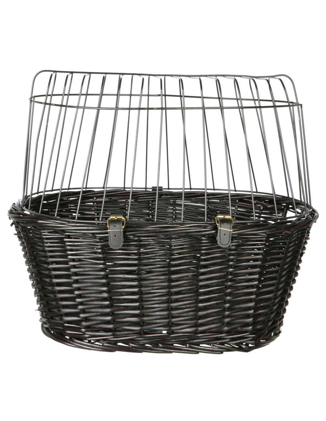 Está fabricada en mimbre con una rejilla de alambre, cubierta de plástico para enganchar al manillar y dos asas con cojín acabado en imitación ante de color antracita.