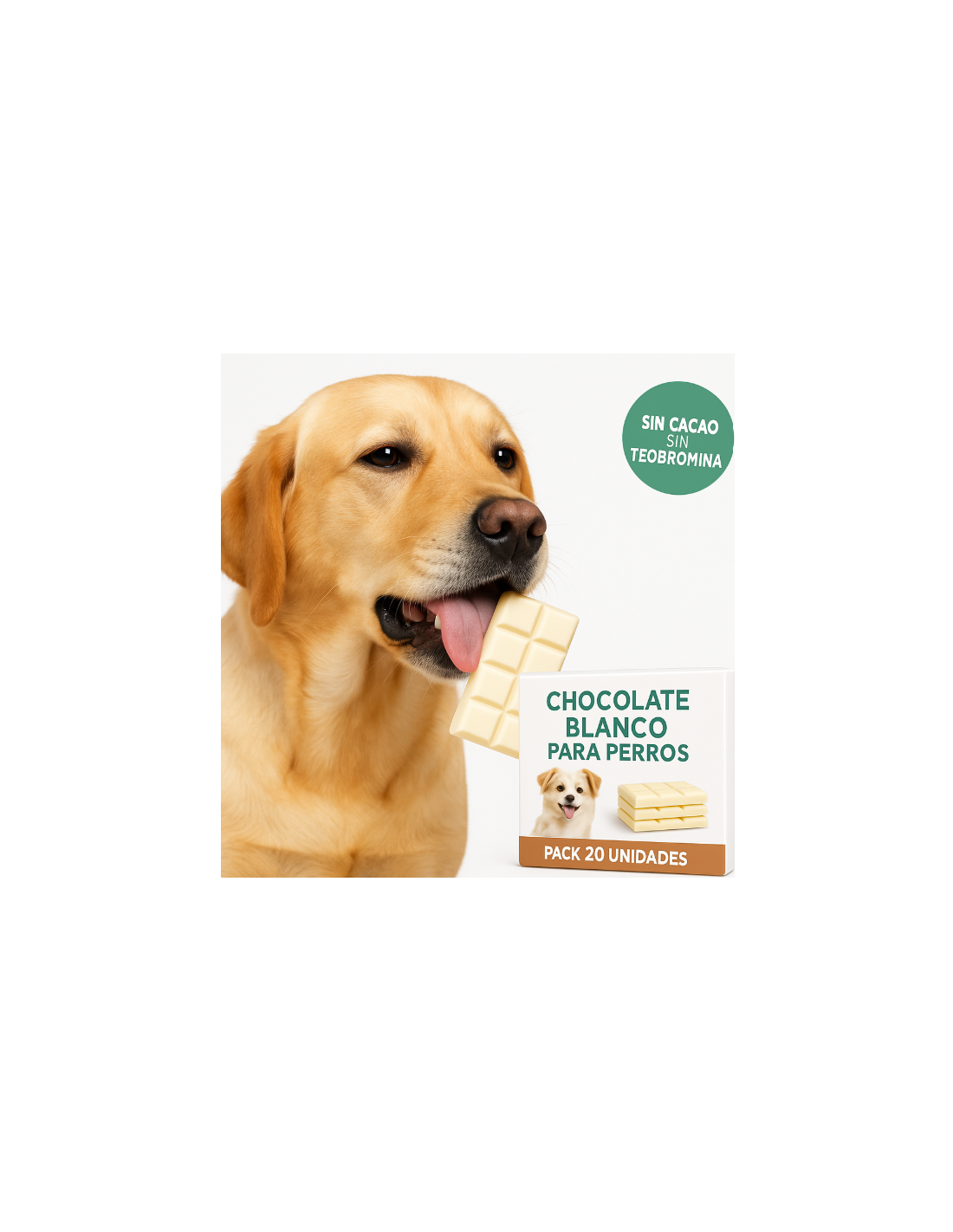 Chocolate blanco seguro para perros, sin cacao ni teobromina. Pack de 20 unidades, ideal como premio saludable para tu mascota.