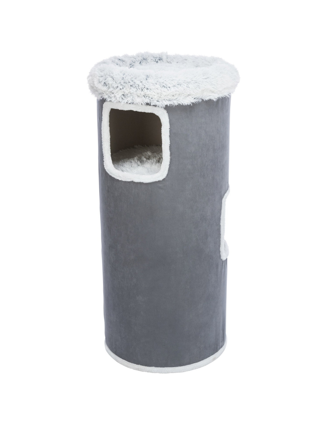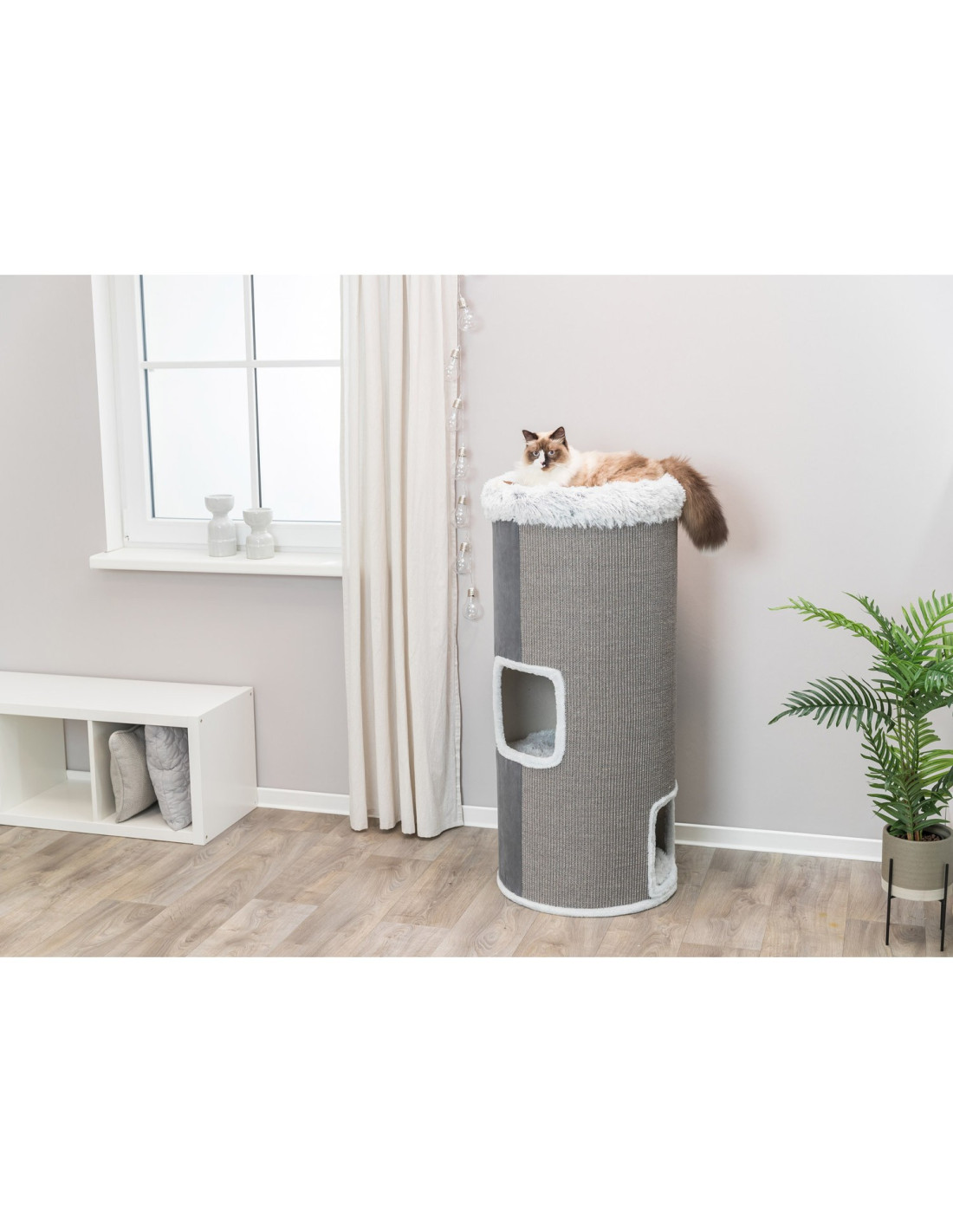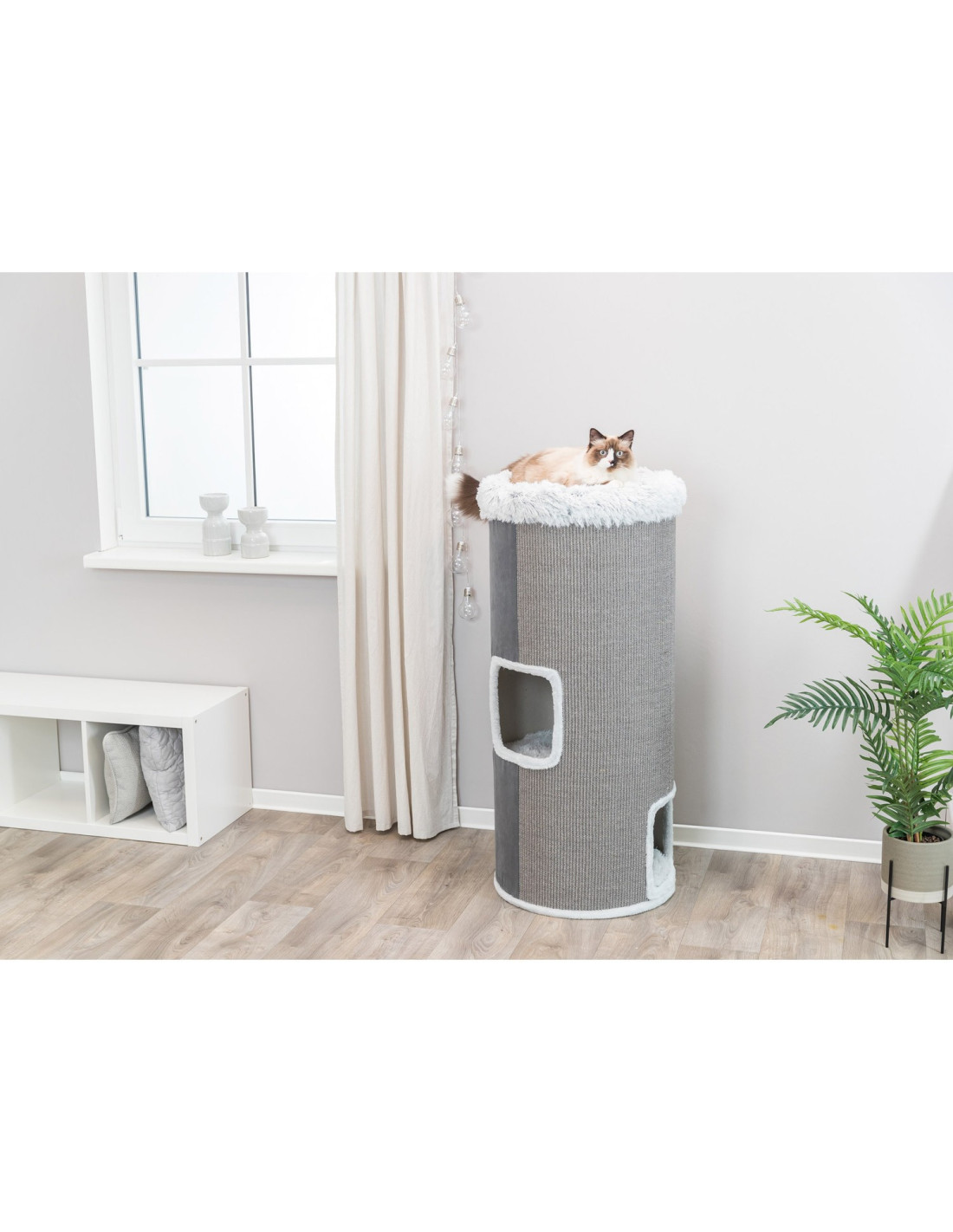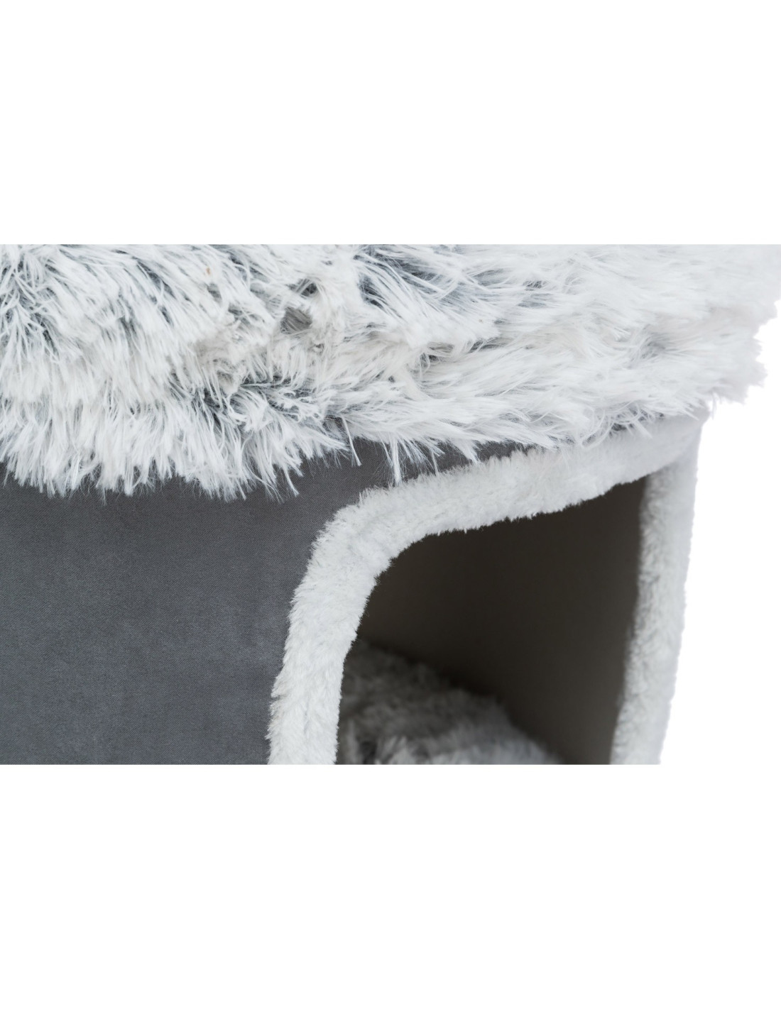 Además, cuenta con una cama suave con borde acolchado y plataformas acolchadas que ofrecen lugares cómodos para que tu gato descanse y observe su entorno. El color gris de la torre rascador se integra fácilmente en cualquier decoración de hogar.