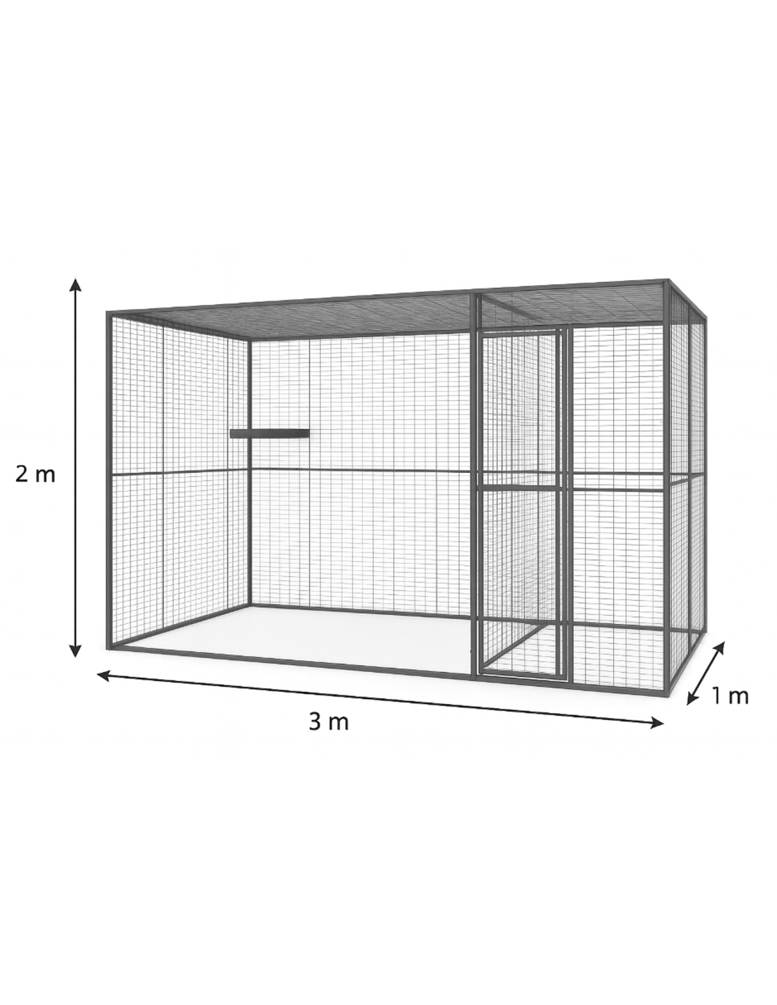 Voladero de loro 3 metros de largo x 1 metro de ancho x 2 metros de alto. Barrotes fuertes para loros, incluido panel con dos comederos guiratorios y puerta peatonal.